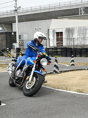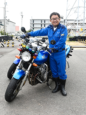 私は主に自動二輪車を中心とした技能教習と検定業務を行っています。自動二輪教習の特徴のひとつに、お客さまの年齢層が幅広いということがあります。これまで教習をさせて頂いた中にも、下は16歳から上は82歳とかなりの幅がありました。82歳の方はとてもアクティブに行動される方で、ある課題が上手くできなかった時、私は年齢的にも大変だろうし無理かなと少し思ったのですが、「出来ないことも楽しい」といってめげずに練習を続けられました。難しいと思うことをそのまま受け入れるということは、自分自身は苦手なことなので、すごいなぁと逆に教えられました。