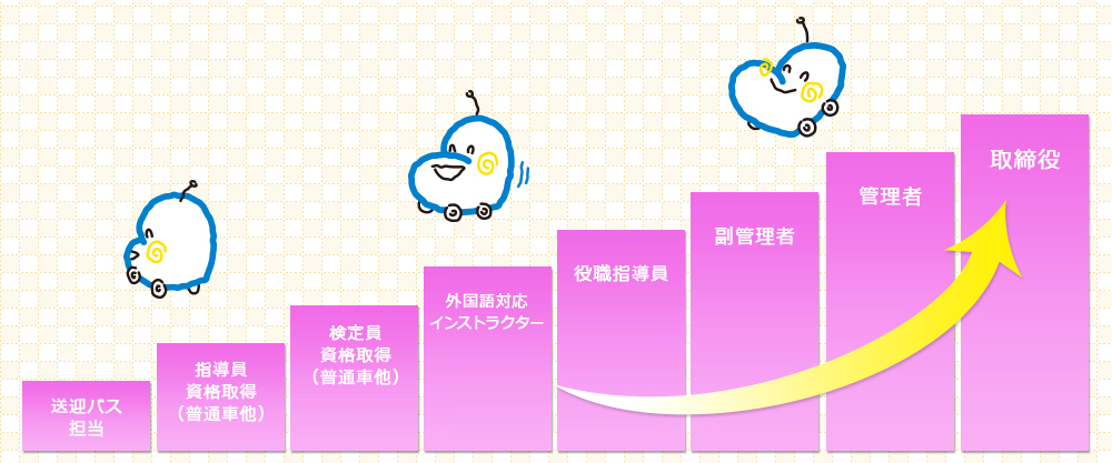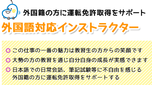 自動車運転教習の実務を勉強しながら、秋、春の(年2回)の資格審査を受検していただき合格後には自動車運転教習指導員として働いていただきます。 資格審査合格後も研修を行います。 その後外国語対応インストラクターになるための研修を行い資格を取得 |